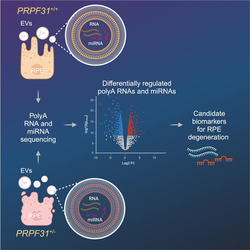 Inherited retinal degenerations (IRD) are important causes of vision loss due to progressive dysfunction of photoreceptor and retinal pigment epithelial (RPE) cells of the retina. Pathogenic variants in the PRPF31 gene are among the most common causes of dominant IRD. In a recent study, published in Molecular Therapy: Methods & Clinical Development, researchers in the Ocular Genomics Institute (OGI) at Mass Eye and Ear demonstrated that extracellular vesicles (EVs) released from PRPF31 mutant RPE cells carry RNA cargo that mirrors the molecular state of their originating cells. Their findings show that the RNA profiles of the EVs from the mutant cells capture disease-induced changes in RPE differentiation and function, highlighting their potential as circulating biomarkers for RP. This research paves the way for the development of non-invasive diagnostic tools that could transform disease monitoring and therapeutic assessment.