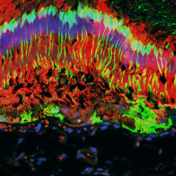 Cepko’s team began by asking: Why do photoreceptors die? The answer hinges on the two kinds of photoreceptors: rod photoreceptor cells, responsible for vision in dim light, and cone photoreceptor cells, responsible for color and detail. In most types of RP, the rods express a disease gene, while cones do not. This means that individuals with RP are born night-blind, but they can see quite well during the day—at first, anyway. Depending on the individual, color vision starts to fade during childhood, while in others it can fade as late as age 50.
