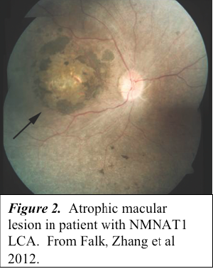 The identification of NMNAT1 as an LCA disease gene raises the question of how mutations in a widely expressed NAD+ biosynthetic protein lead to a retina-specific phenotype. The answer to this question is of particular interest because the majority of patients with NMNAT1-LCA have atrophic macular lesions, suggesting that macular cones are especially dependent upon NMNAT1 activity (Figure 2) (2-5). Of interest, NMNAT1 is the principle component of the Wallerian degeneration slow (WldS) fusion protein which has been found in mice to permit injured axons to survive ten times longer than normal (9-11).