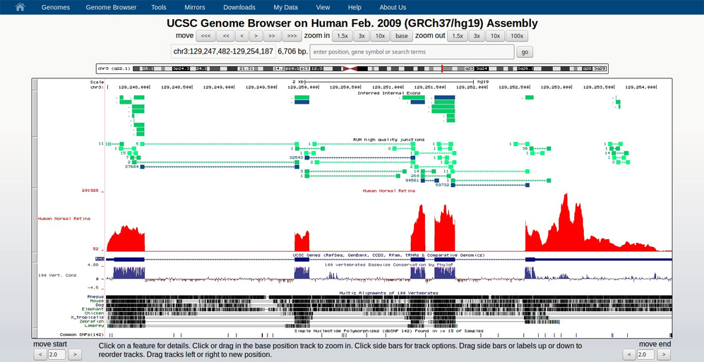The human retinal transcriptome data, available on the UCSC Genome Browser, was derived by performing RNA-Seq on 3 normal retina samples. Over 300 million 101 bp paired-end reads were aligned using the RNA-Seq Unified Mapper . These data are available as a resource to the research community and can be used to identify novel alternative splicing events, relative gene expression levels, as well as novel gene expression.