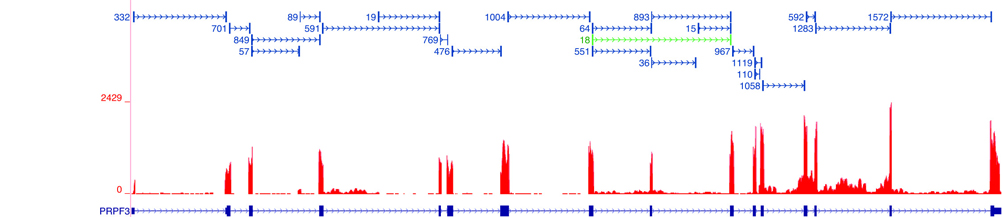 The human retinal transcriptome data, available on the UCSC Genome Browser, was derived by performing RNA-Seq on 3 normal retina samples. Over 300 million 101 bp paired-end reads were aligned using the RNA-Seq Unified Mapper . These data are available as a resource to the research community and can be used to identify novel alternative splicing events, relative gene expression levels, as well as novel gene expression.